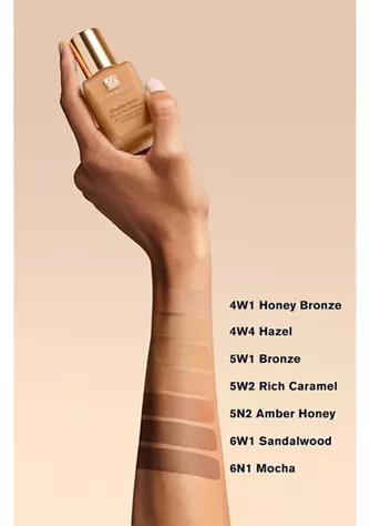 | ESTEE LAUDER FOUNDATION | 1C0 SHELL, 1N2 ECRU, 1W2 SAND, 2C1 PURE BEIGE, 3N1 IVORY BEIGE, 3N2 WHEAT, 3W1.5 FAWN, 4N1 SHELL BEIGE, 4N2 SPICED SAND, 4W1 HONEY BRONZE, 5C2 SEPIA, 5N1 RICH GINGER, 5W1 BRONZE, 5W2 RICH CARAMEL, 6N1 MOCHA, 6W1 SANDALWOOD |