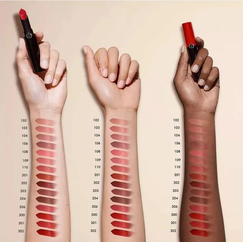 • As wear and color means no compromise for Armani Beauty, this new matte lipstick also offers extra comfort during 16 hours thanks to a lightweight oil complex including care ingredients like jojoba oil and organic olive oil.